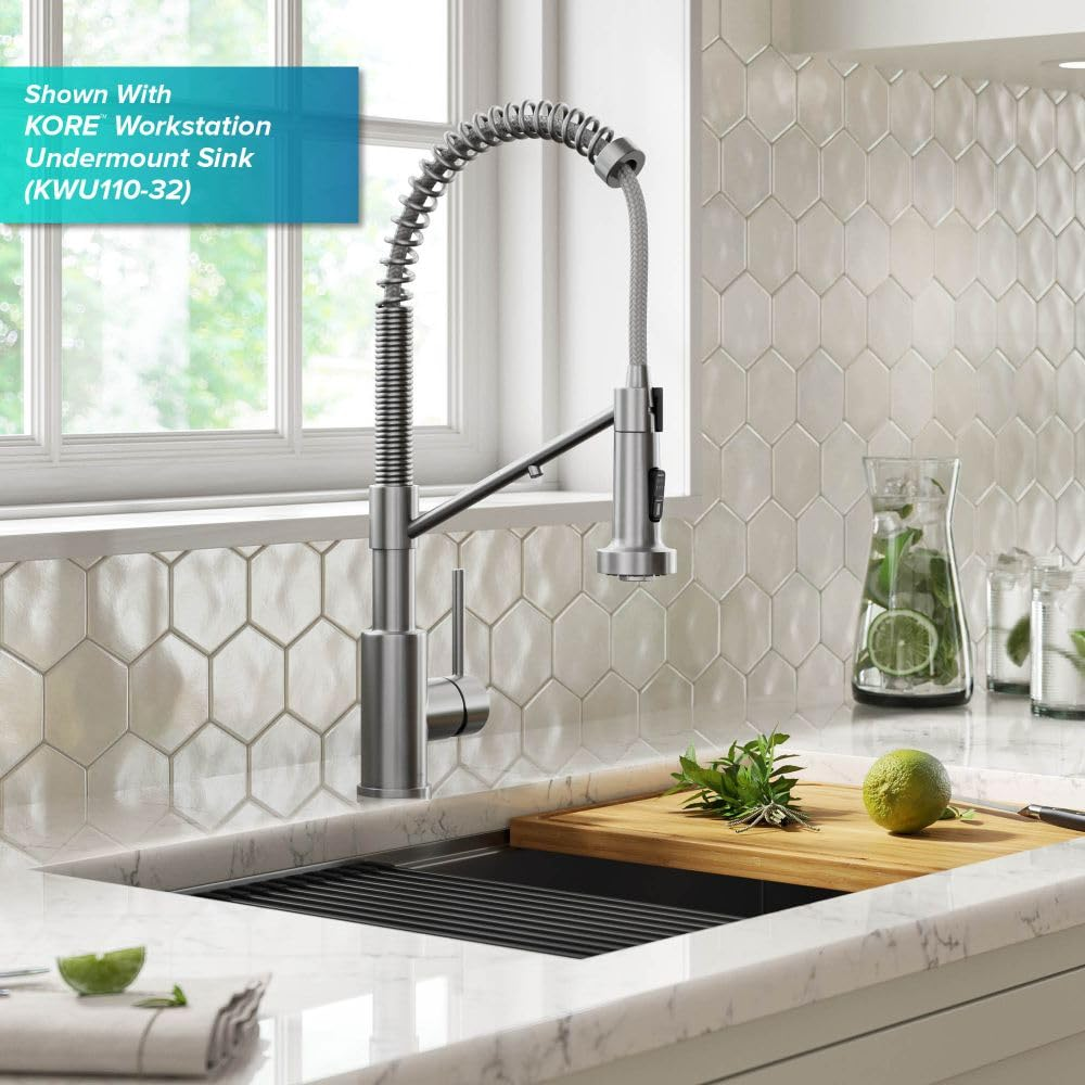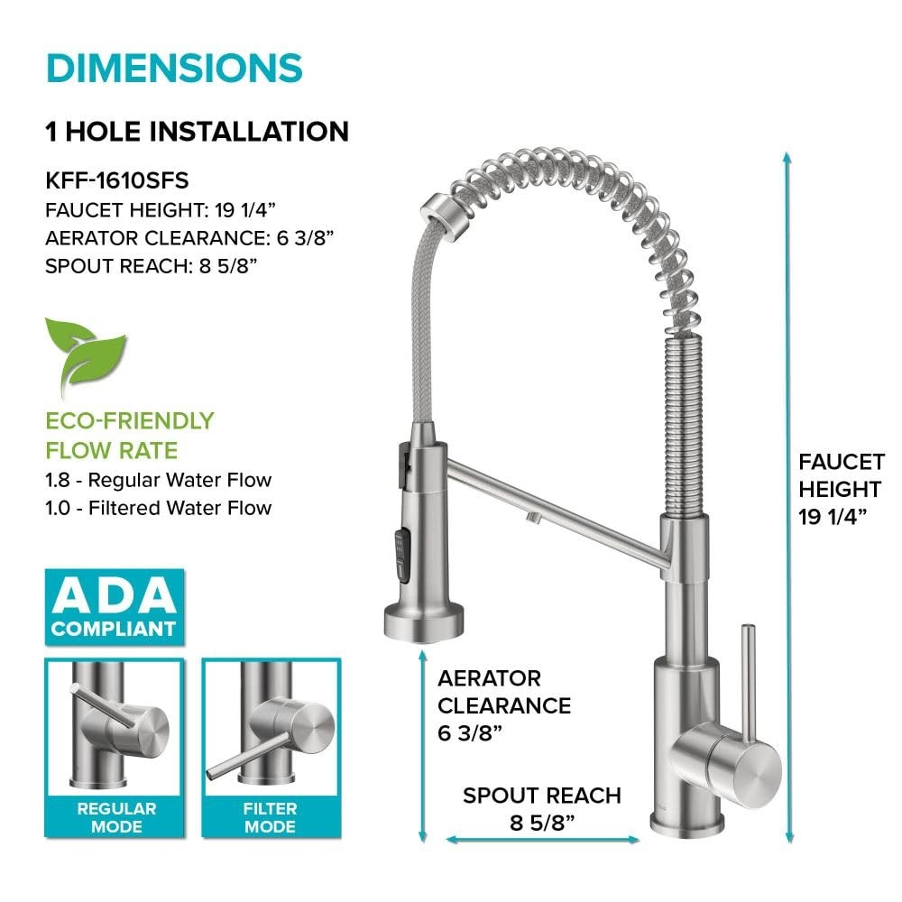 DIMENSIONS: Overall Height: 18 3/4 in. – Spout Height: 6 3/8 in. – Spout Reach 8 5/8 in. – Swivels 360° – Flow Rate 1.8 gpm – COMMERCIAL KITCHEN FAUCET with sleek open-coil spout and pull-down sprayhead with extended range of motion