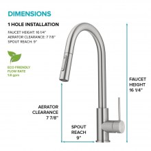 UNIVERSAL DESIGN: Streamlined and elegant, the Contemporary Pull-Down Faucet features a clean minimalist design with universal appeal for any kitchen or laundry room – SPOT-FREE FINISH prevents water spots and fingerprints for a cleaner faucet, RESISTS CORROSION, and is exceptionally EASY-TO-KEEP-CLEAN without the use of abrasive chemicals or cleaners – PERFECT FIT: Optimized 16 1/4 in. height fits under any cabinet for installation flexibility – DIMENSIONS: Faucet Height: 16 1/4 in. – Spout Height: 7 7/8 in. – Spout Reach 9 in.
