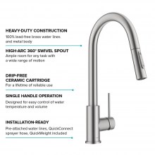 HEAVY-DUTY CONSTRUCTION: 100% LEAD-FREE BRASS water lines and metal body ensure reliable long-lasting performance that will add value to any home – PULL-DOWN SPRAYHEAD with Reach Technology offers maximum maneuverability, with an easy-retract hose and SWIVEL ADAPTER that enables a full range of motion so you can flex, pivot, and reach all around the sink – DUAL-FUNCTION SPRAYHEAD: Switch between aerated stream for everyday cleaning and powerful spray for heavy-duty rinsing