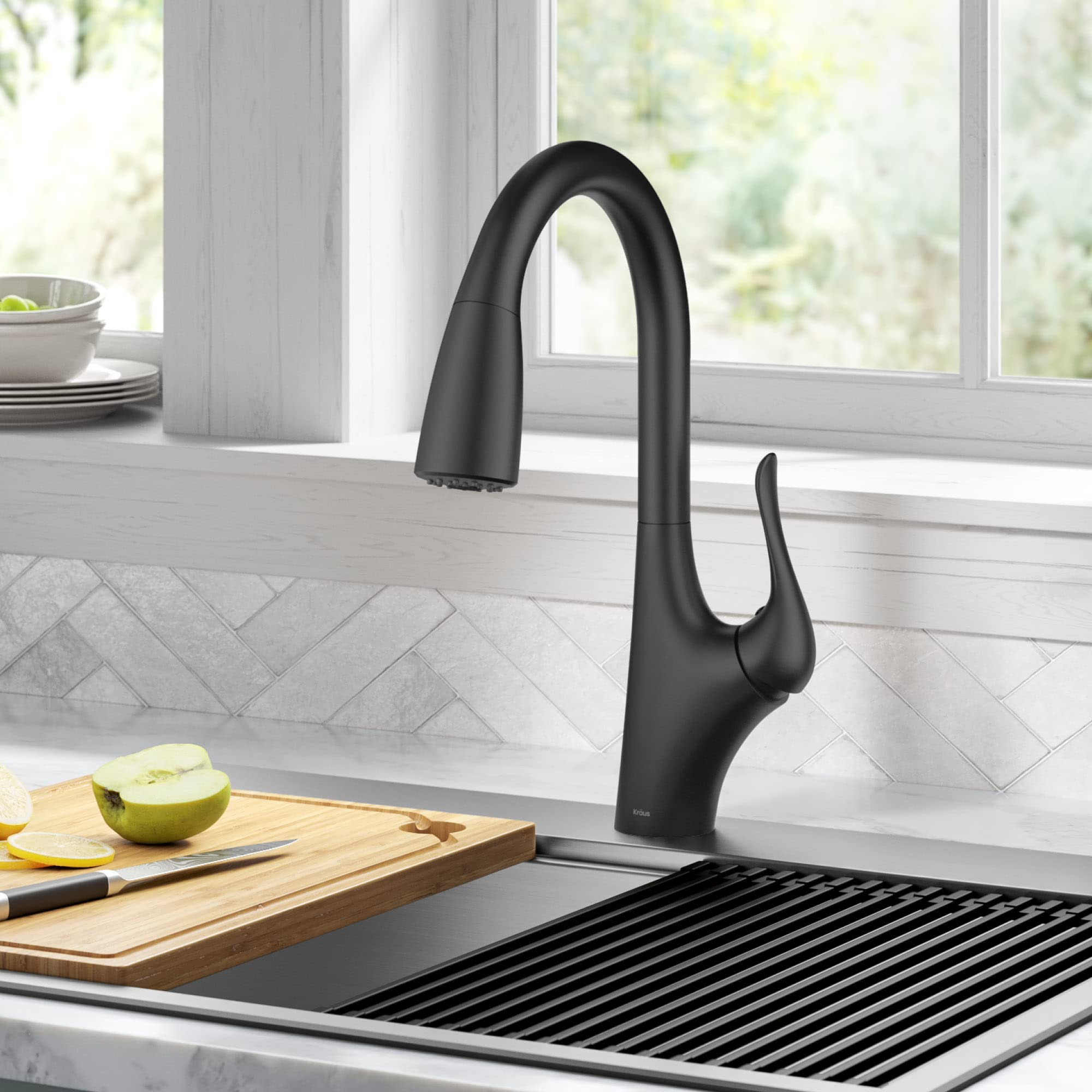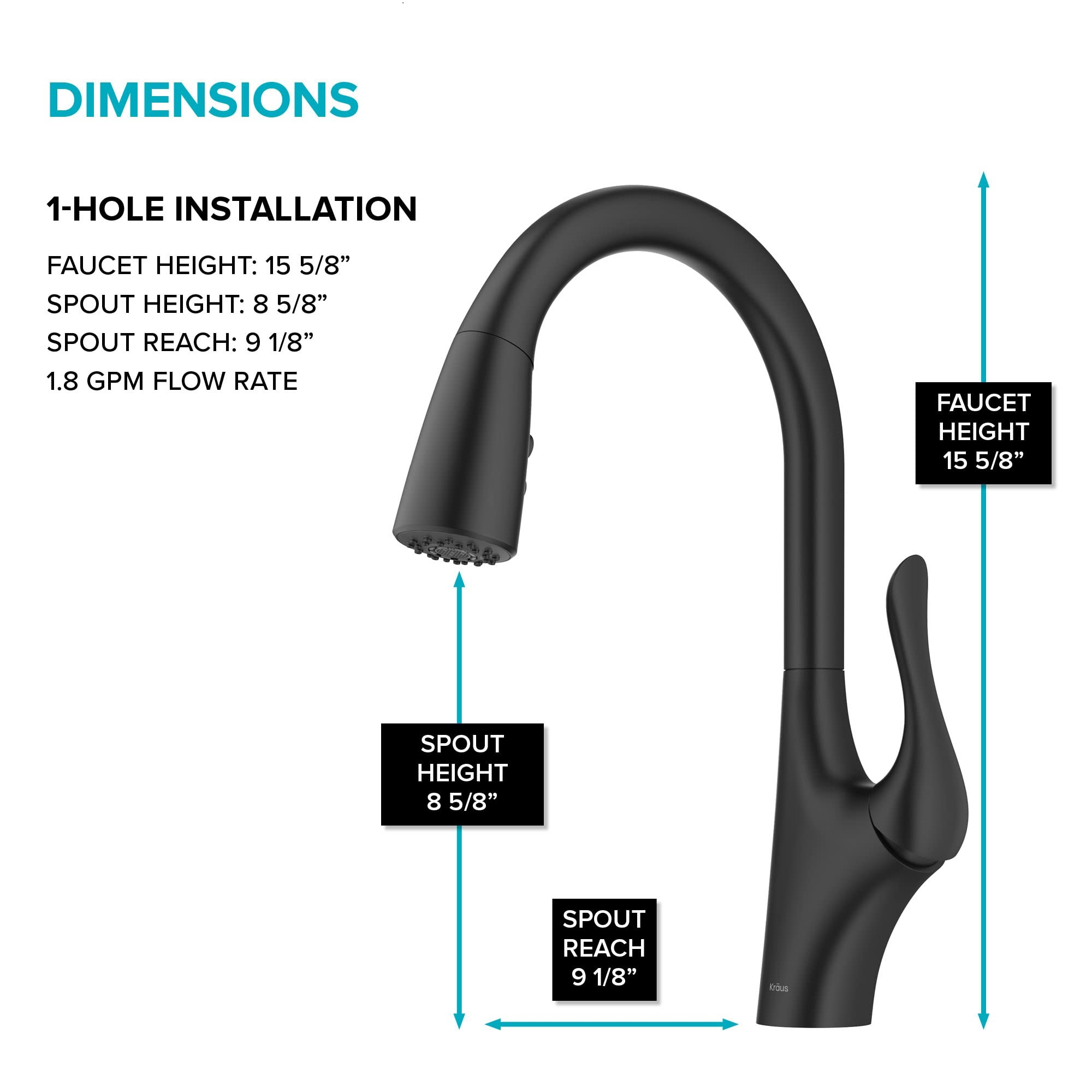 TRANSITIONAL STYLE: The Pull-Down Faucet features an elegant organic shape with universal appeal that complements any kitchen décor – OPTIMIZED HEIGHT: 15 5/8 -inch faucet fits underneath standard kitchen cabinets where other faucets will not fit – FAUCET HEIGHT: 15 5/8 in. – SPOUT HEIGHT: 8 5/8 in. – SPOUT REACH: 9 1/8 in. – SWIVELS 360 degrees for a broad range of motion – Flow Rate 1.8 gpm