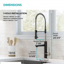 DURABLE ALL-METAL CONSTRUCTION with solid brass body and stainless steel spring spout; HIGH-ARC SPOUT swivels 360° for a full range of motion, offers ample clearance for cleaning your largest cookware – DIMENSIONS: Faucet Height: 24 3/4 in., Spout Height: 6 5/8 in., Spout Reach 7 5/8 in., Sprayer Height 11 1/4 in., Sprayer Reach 7 1/8 in.