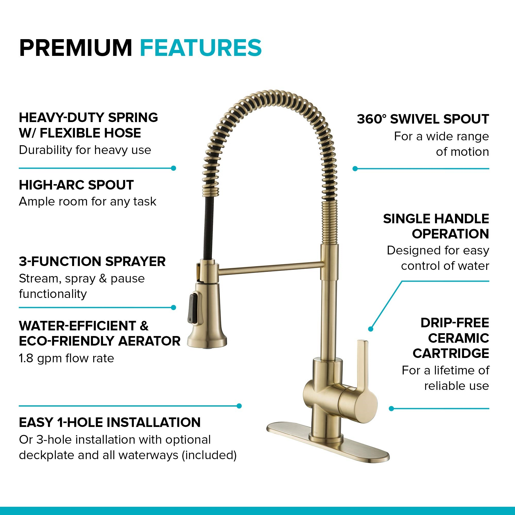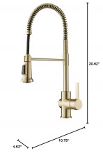 COMMERCIAL FAUCET DESIGN with a heavy-duty open coil spring spout creates an industrial look with modern appeal – DIMENSIONS: Kitchen Faucet Height: 20 5/8 in. - Spout Height: 6 3/8 in. - Spout Reach 8 1/2 in. - Flow Rate 1.8 gpm