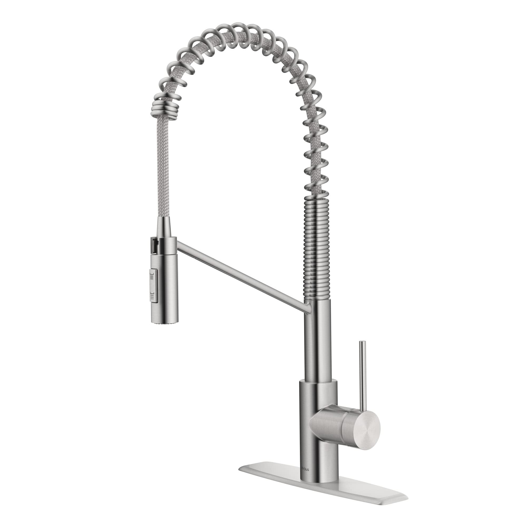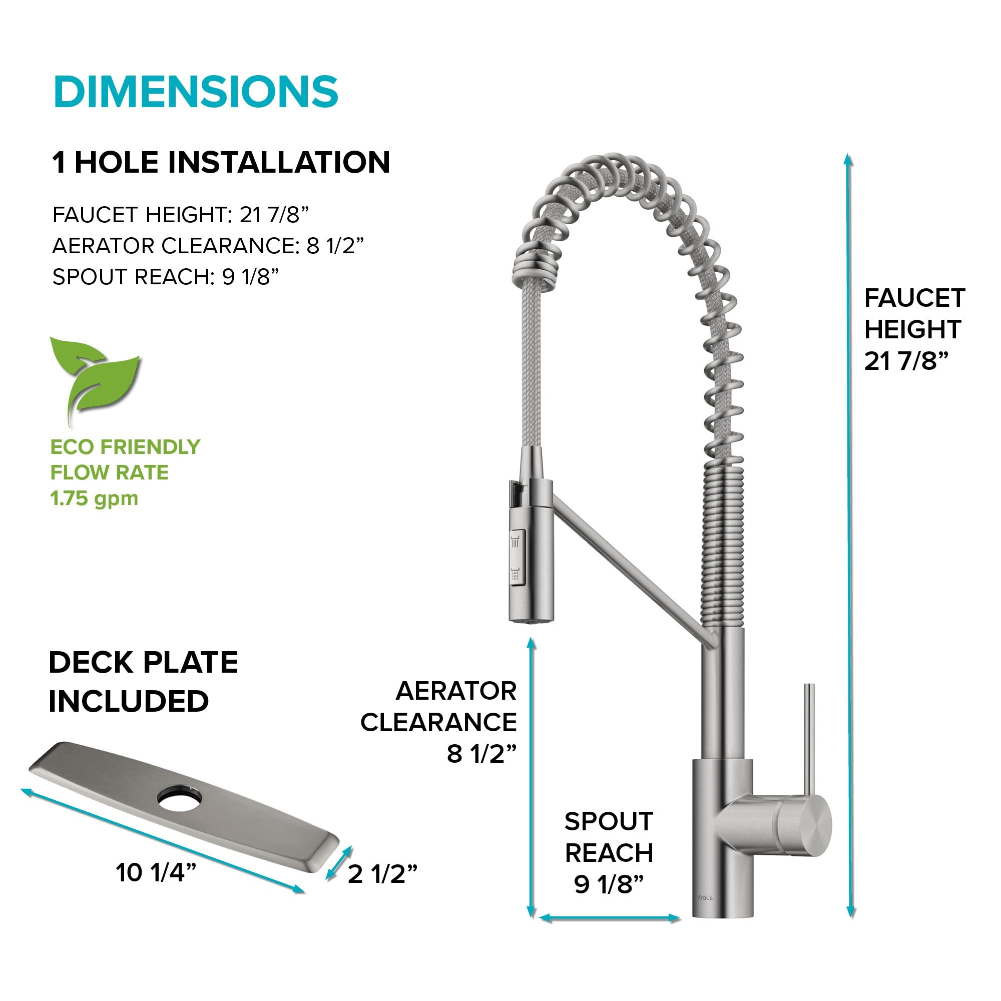 COMMERCIAL FAUCET DESIGN with an industrial open-coil spout and provides the convenience of a pull down faucet sprayer – DIMENSIONS: Kitchen Faucet Height: 21 7/8 in. – Spout Height: 8 1/2 in. – Spout Reach 9 1/8 in. – Swivels 360° – Flow Rate 1.8 gpm